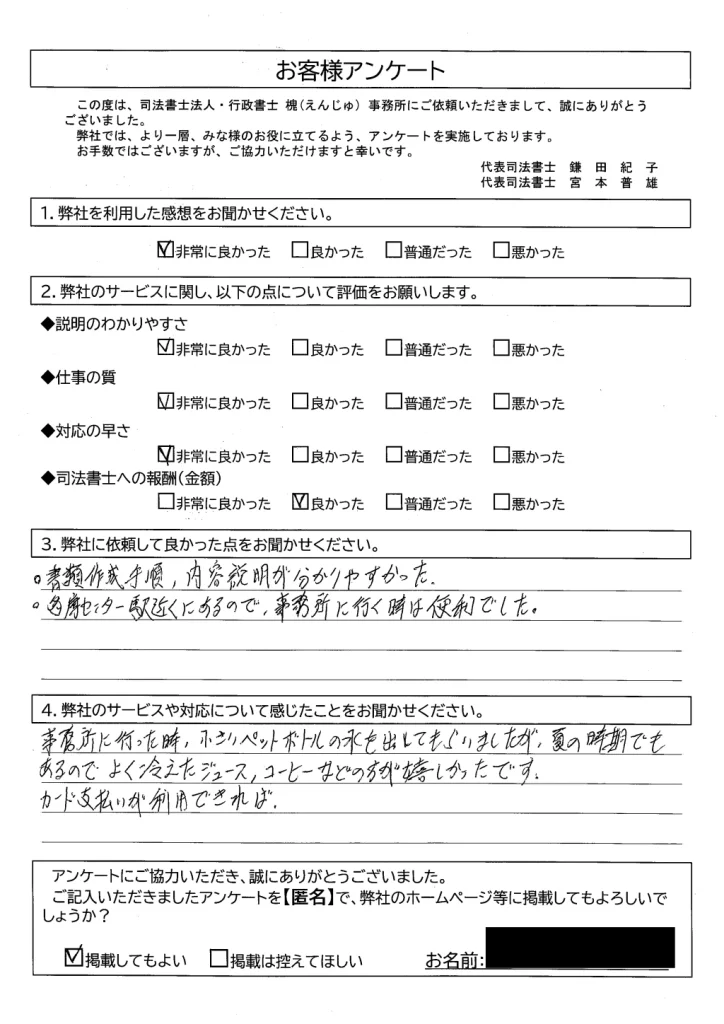 この度は、当事務所にご依頼いただき、また率直なご感想をお寄せいただき、誠にありがとうございました。